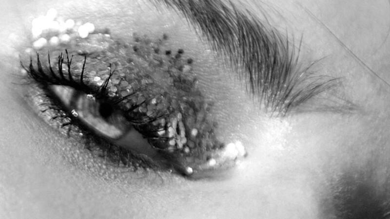 3. Con el mismo dedo se toman las lentejuelas y se dan leves golpes en el párpado móvil, hasta cubrir homogéneamente. Para asegurar la adhesión, y evitar ensuciar los contornos, es bueno inclinar la cabeza hacia atrás unos segundos.
