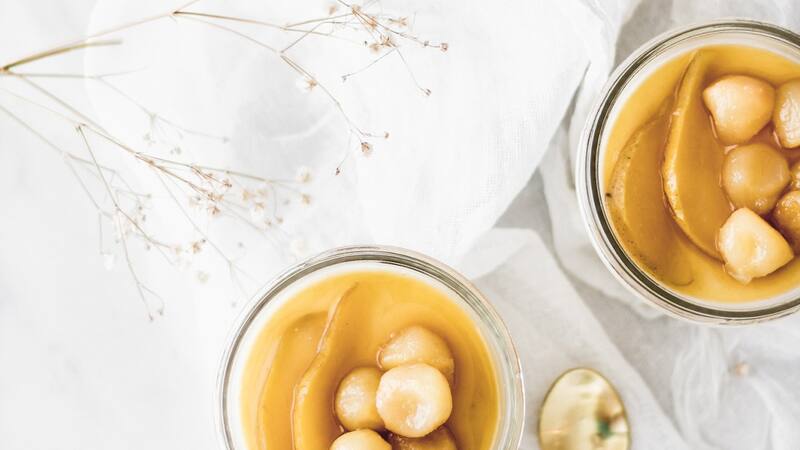 Panna cotta de cardamomo con peras a la miel