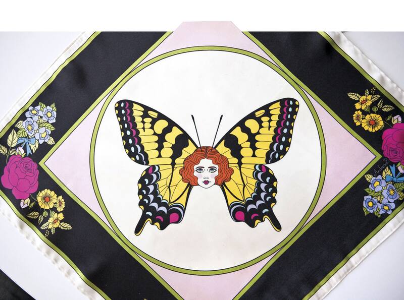 Andrea Barja (35) es diseñadora gráfica, pero su interés se reparte entre esa área y la moda. Después de que en 2016 hizo su primer pañuelo de 45x45, con una mariposa estampada en tafetán y una estética que evocaba a los años 20, ahora se aventura con una colección de cinco piezas, del mismo formato y más grande (75x75) con caras de mujeres, insectos y flores sublimadas, también en tafetán, que avanzan hacia la década de los 60. "Me gusta el diseño textil y el pañuelo es una plataforma para empezar a investigar. Es simple, pero puedes hacer dibujos complejos", dice. Además, cita a dos apasionados del color: la cantante Lady Miss Kier, de la banda neoyorquina Deee-Lite, y el diseñador italiano Emilio Pucci. $ 25.000 y $ 80.000 a través de Instagram @andreabarja o del mail andreabarja@gmail.com