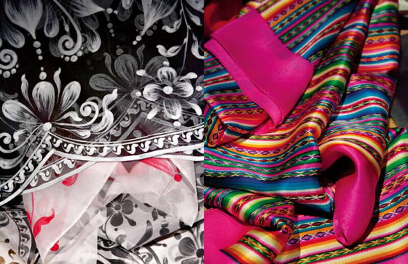 Así reinterpreta meche la artesanía peruana. A la izquierda: finas Estolas de gasa pintadas a mano en colores y pan de oro por los mismos artesanos que dibujan las mangas de encaje de los santos en los cuadros cuzqueños. A la derecha: el diseño típico de las mantas Lliclla, que usan las mujeres indígenas para transportar a sus guaguas, se trasladó a elegantes pañuelos de seda.