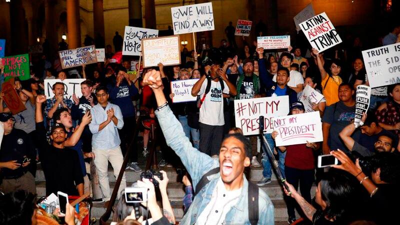 Ahora que la realidad de haber elegido a un hombre que nunca fue categórico para rechazar el apoyo del Ku Klux Klan comenzaba a hacerse tan inevitable como el amanecer, miles de personas comenzaban a cultivar un resentimiento que los llevaría, al final de ese día que comenzaba en la sorpresa de la derrota, a gritar a las calles. La frustración se transformaría en rabia y la rabia se transformaría en marcha. El punto de partida sería Union Square, en la calle 14, y el de llegada no podía ser otro que la Torre Trump en la Quinta Avenida con la calle 57, un edificio negro de grandes puertas doradas donde vive el presidente electo. Lo mismo pasaría en otras ciudades del país. Las manifestaciones se repetirían al día siguiente. ¿Qué buscaban? Dependía de a quién le preguntara uno. Unos dirían que el colegio electoral -que se reúne el 19 de diciembre para formalmente "votar" por el presidente- debía rechazar a Trump (algo imposible). Otros destacarían el dato de que en cuanto a voto popular la candidata demócrata había sumado más que el republicano- que debía reformarse el sistema de elecciones para que algo así no se repitiera. Otros querían simplemente que el mundo se diera cuenta de su tristeza, frustración, rabia y preocupación por la elección que había hecho su país.