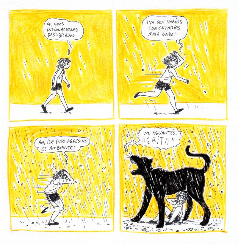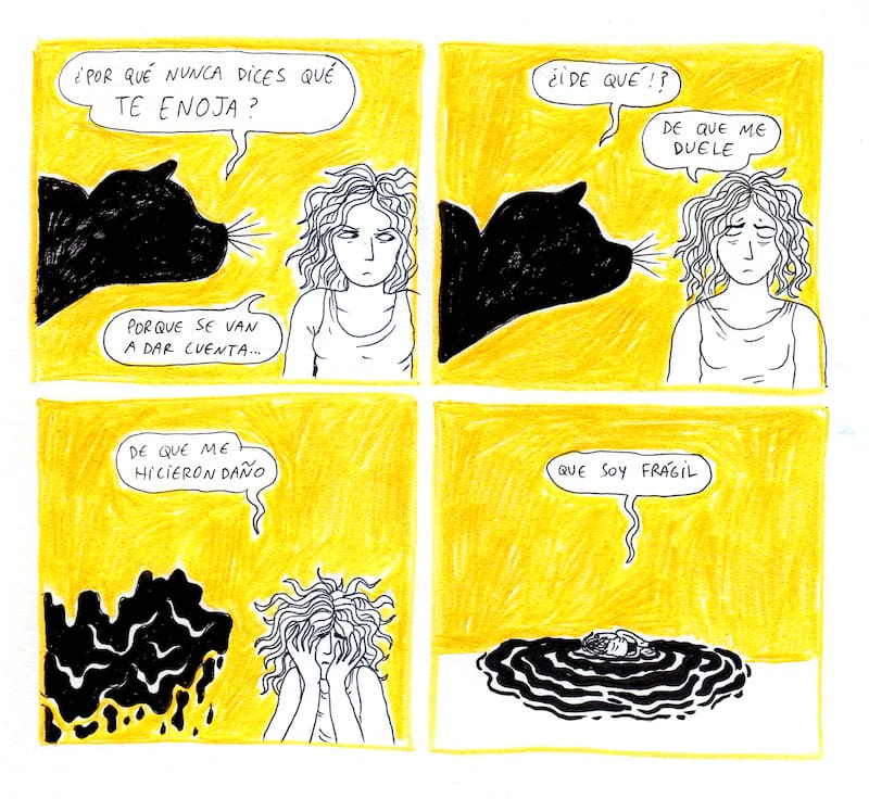 Junto al negro, el libro solo tiene otros dos colores: blanco y amarillo, que simulan la luz, la libertad que decir lo que sentimos puede darnos a través de esa rabia. Y enumera una serie de situaciones: tener la libertad de enojarnos cuando vemos injusticias, cuando somos víctimas de acoso callejero, cuando somos explotadas en el trabajo, cuando caemos en el síndrome del impostor.
