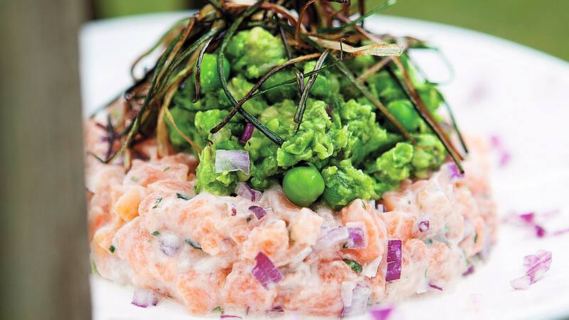4. En platos individuales colocar al centro el tártaro, encima una porción de tapenade de arvejas y decorar con el cebollín crocante reservado, pimienta rosada y un poco aceite de oliva. Servir de inmediato.