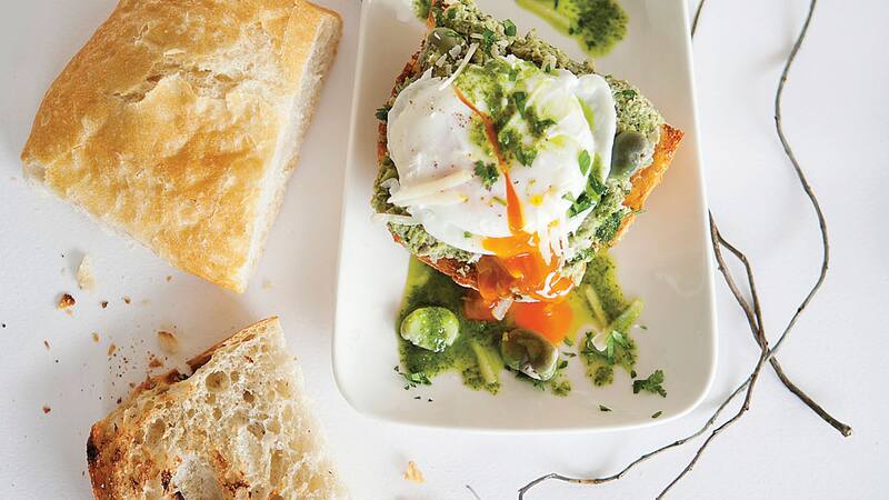 4. Frotar las tostadas con el diente de ajo y algunas gotas de aceite de perejil. Cubrir el pan con el puré de habas reservado, colocar un huevo pochado encima. Decorar con hojas y aceite de perejil.