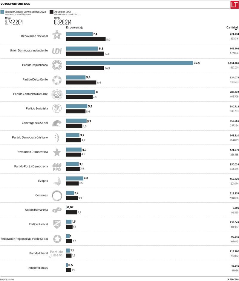 La tienda del excandidato presidencial José Antonio Kast sumó casi tres millones de votos en la votación para el Consejo Constitucional respecto a la elección de diputados del 2021. Esto, mientras partidos como RN y la UDI perdieron hasta 30% de apoyos. En la izquierda, partidos como el PPD y la DC son los que más porcentaje de votación pierden.