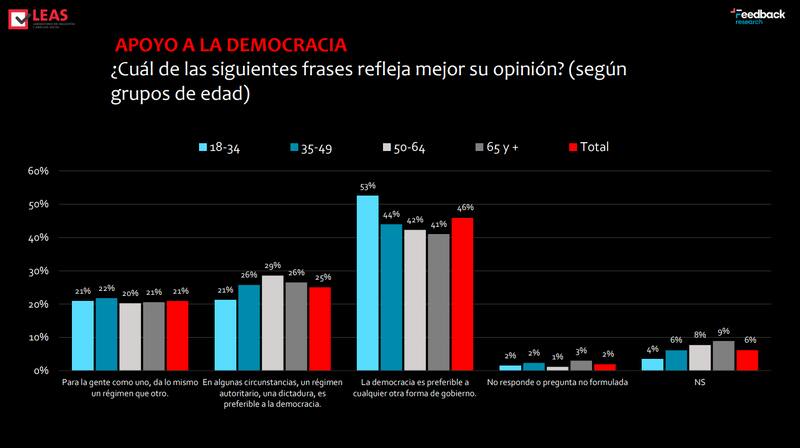 Al desglosar estos resultados, para el 2021 los jóvenes (entre 18-34 años) son los que en su mayoría creen que la democracia es preferible ante cualquier otra forma de gobierno con un 53%. Sin embargo, entre los 35 y 49 años baja casi 10 puntos, a 44%; desde los 50 a los 64 años a 42% y desde 65 años y más, a 41%. Es decir, con cada rango etario va bajando de manera escalonada.