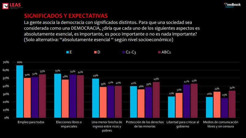 Otro hallazgo que llamó la atención de los investigadores fue que los encuestados consideran que para que una sociedad sea democrática priman los derechos económicos por sobre los políticos o sociales. Esto se traduce en que evalúan como “absolutamente esencial”: empleo para todos (54%) y una menor brecha de ingreso entre ricos y pobres (41%). En cambio, un 36% evalúa preferentemente la “libertad para criticar al gobierno” o “medios de comunicación libres y sin censura” con un 30%.