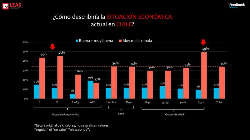El estudio realizado por LEAS y Feedback también caracterizó que de los sectores socioeconómicos, sólo el 5% de los encuestados pertenecientes a la clase media típica (C2) y la media baja (C3) describen su situación económica como “bueno o muy buena”. Mientras que la clase media vulnerable (D) lo evalúa mejor con 12% y los más vulnerables con 15%.