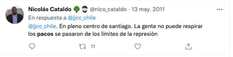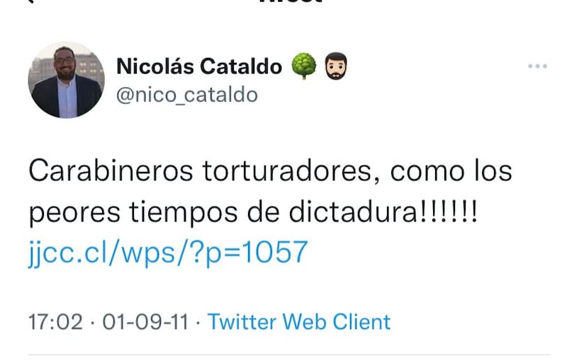 Nicolás Cataldo (PC) escribió en 2011 -y también en 2021- una serie de mensajes en Twitter alusivos a la manera de actuar de Carabineros en las manifestaciones sociales. A pocos minutos de asumir, borró todo, sin embargo su designación no se concretó.