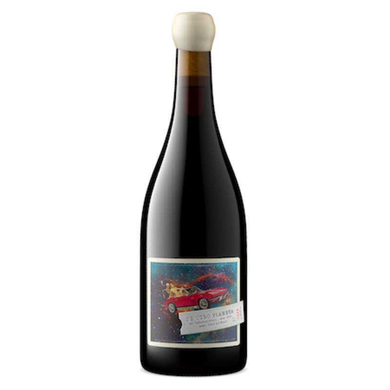 Aquí tienes un cabernet franc cosecha 2019, del valle de Maipo, también de Casa Libre, bodega que cosecha a mano uvas orgánicas guardadas 9 meses en tinajas de greda, por lo que se trata de un vino crudo, que te habla sin rodeos. Como no hay madera, la greda lo oxigena lo suficiente como para protegerlo naturalmente —tampoco tiene sulfitos—, y el resultado es un tinto desnudo y honesto. Arándanos y moras frescas revolotean por toda tu nariz y boca, sin más añadidos: solo la fruta misma, impecable, masticable, fresca y rica, jugosa y bastante densa, con un sutil final amargo, como de chocolate bitter y ruibarbo, es decir, con esa acidez natural característica de una fruta neta. El nombre surgió haciendo otro vino, el sauvignon gris —cepa poco desarrollada en Chile— que para los enólogos era “una locura, algo galáctico”… ¡de otro planeta! La etiqueta va por la misma línea: es una especie de Volver al Futuro descapotable, aunque rojo y con una rubia escoltada por un esqueleto y la Vía Láctea de fondo. O algo así. De otro planeta.