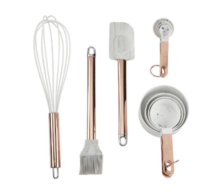 Después de ver tantas recetas a toda velocidad en Tiktok seguro te dan ganas de hacerlas en casa, pero abres un cajón y solo encuentras tenedores, un sacacorcho y palitos de sushi. Por muy fácil que parezca hacer un queque o unas galletas, necesitas uno que otro utensilio para que la experiencia sea feliz. Este set trae todo lo fundamental —espátula, batidor, cuatro cucharas medidoras, cuatro tazas medidoras y una brocha—, además con distinguidos mangos marmolados. Tus herramientas de cocina no solo serán eficientes, sino que bonitas y compactas.