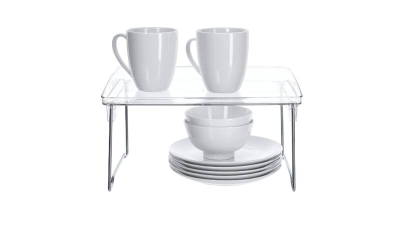Si estás luchando contra el espacio en tu despensa, y eso te quita las ganas de cocinar, este set de repisas apilables es justamente lo que necesitas. Cada una logra sostener hasta 5 kilos, por lo que son ideales para ordenar vasos, tazas, platos de té o también latas, conservas, frascos y abarrotes. Tienen una medida de 31 cm de ancho, 22,5 cm de largo y 16,8 cm de alto.