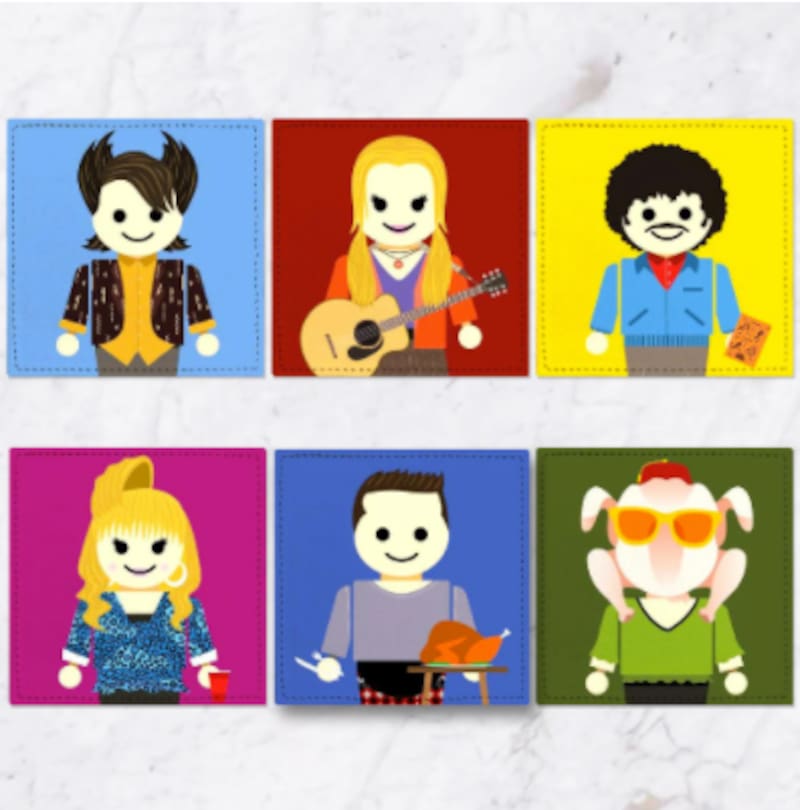 Son seis posavasos ilustrados por Rafa Gomes, uno para cada personaje —caracterizado en una escena específica de la serie Friends—, los que de seguro serán el centro de atención en tus pequeñas fiestas con amigos.