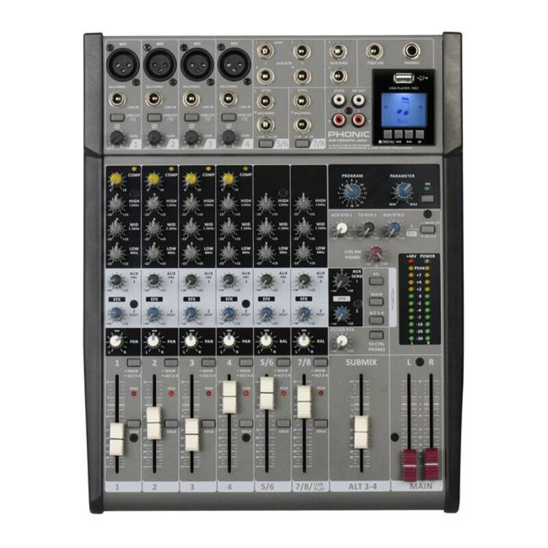 Ahora, si se quiere agregar un dispositivo analógico a la cadena, se puede optar por este mixer Phonic AM1204FX, que además de contar con salida RCA, posee una interfaz de audio estéreo USB que permite que dos pistas de audio se puedan transmitir hacia y desde cualquier PC o Mac.