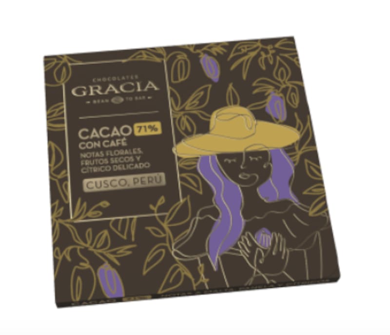 Cada barra tiene altos porcentajes de cacao y a un muy buen precio. La siguiente, por ejemplo, es una “bean to bar” de 71%, elaborada con un cacao de Cusco llamado “Chuncho”, una rareza que se cultiva en la zona amazónica cercana al Valle Sagrado de los Incas. Además, está mezclada con unos toques de café. Una alternativa para paladares que gozan del café y son capaces de apreciar sabores complejos. No contiene aditivos.