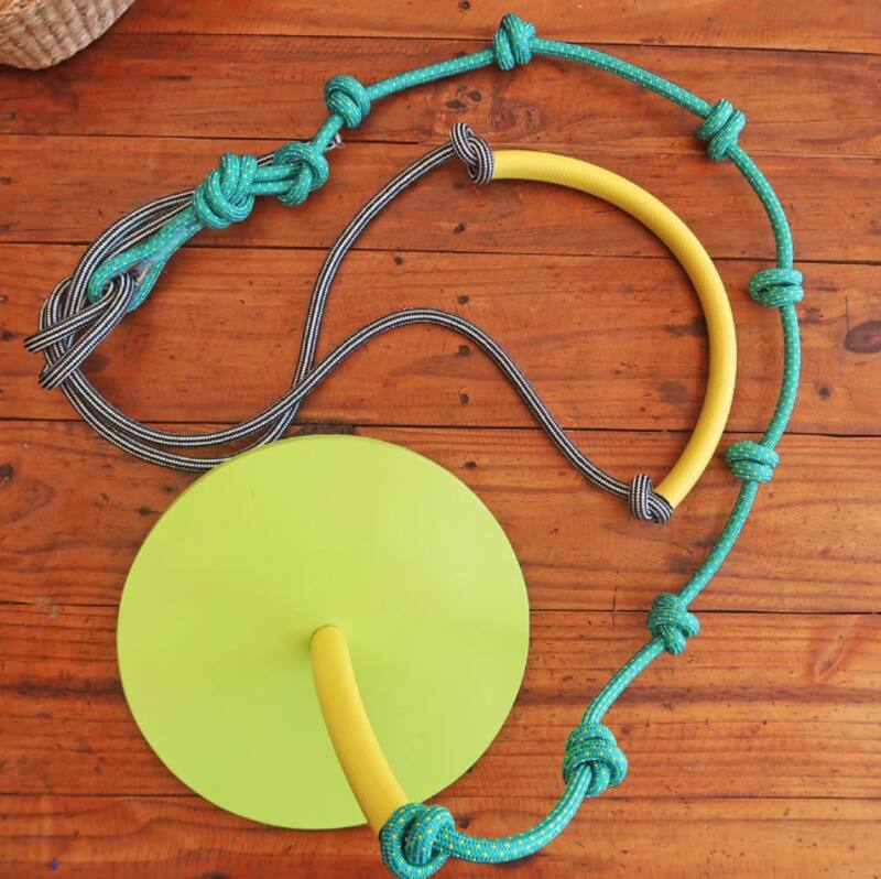 Este es un treplato: mezcla la clásica trepa con un pequeño columpio, todo de una firme cuerda y grueso plato de madera para sentarse, fácil de colgar de cualquier árbol o viga.