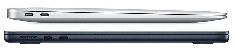 Al abrir la pantalla (algo que se puede hacer con sólo un dedo) nos encontramos con el renovado diseño interior del MacBook Air. Lo más llamativo es que el declive tradicional de su diseño (el famoso wedge, con forma de púa) ya no existe. Ahora tenemos un look mucho más plano y uniforme, muy similar al modelo Pro 2021 de 14″ —de hecho, uno al lado del otro son fácilmente confundibles— pero con una delgadez (apenas 11,3 mm de grosor) aún más fina que la generación anterior y un peso pluma que claramente lo hacen un aparato ultra portátil. Con ello también ganan una pantalla algo más grande (13,6 pulgadas).