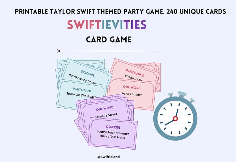 Esta es otra idea para hacer en grupo. Se trata del clásico juego de mímica o charadas, pero con el giro de ser exclusivamente sobre Taylor Swift. Puedes hacer tus propias tarjetas, con títulos de canciones, álbumes o personas vinculadas a su mundo —exparejas como Harry Styles o amigas como Selena Gómez—, y quien saca una debe luego representar el concepto sin hablar.