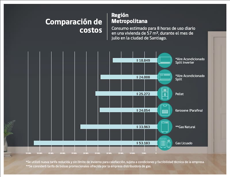 La Guía de Calefacción Sustentable, publicada el 2020 por el Ministerio del Medio Ambiente, dice que el método más económico —sin contar la inversión por el aparato ni su instalación— es el aire acondicionado split inverter. Usándolo 8 horas al día, durante el mes de julio y en una vivienda de 57m2 en Santiago, gastará menos de la mitad que un aparato a gas licuado, como una estufa.