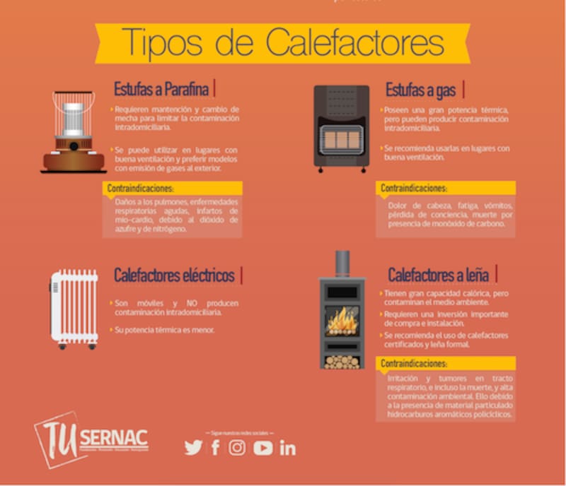 “Tienen la virtud de que son movibles y de que los aparatos no son tan caros”, dice Miguel Castro. “Pero su combustible sí es mucho más costoso”. El rango calefactor que tienen es de 40 m2, aproximadamente, y no están recomendadas para habitaciones o espacios pequeños, ya que contaminan el aire muy rápidamente.