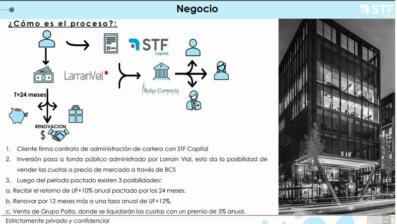 “¿Cómo es el proceso?”, titulaba una de las láminas de la presentación. Y en ella se explicaba: “1) Cliente firma contrato de administración de cartera con STF Capital. 2) Inversión pasa a fondo público administrado por Larrain Vial, esto da la posibilidad de vender las cuotas a precio de mercado a través de BCS. 3) Luego del período pactado existen 3 posibilidades: A) Recibir el retorno de UF+10% anual pactado por los 24 meses. B) Renovar por 12 meses más a una tasa anual de UF+12%. C) Venta de Grupo Patio, donde se liquidarán las cuotas con un premio de 5% anual”.