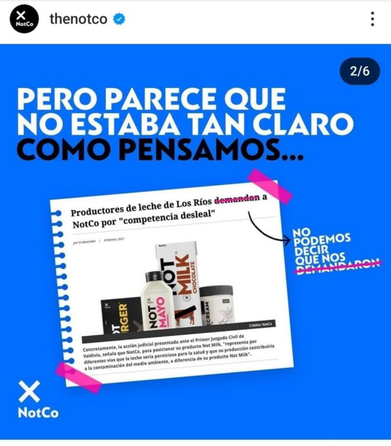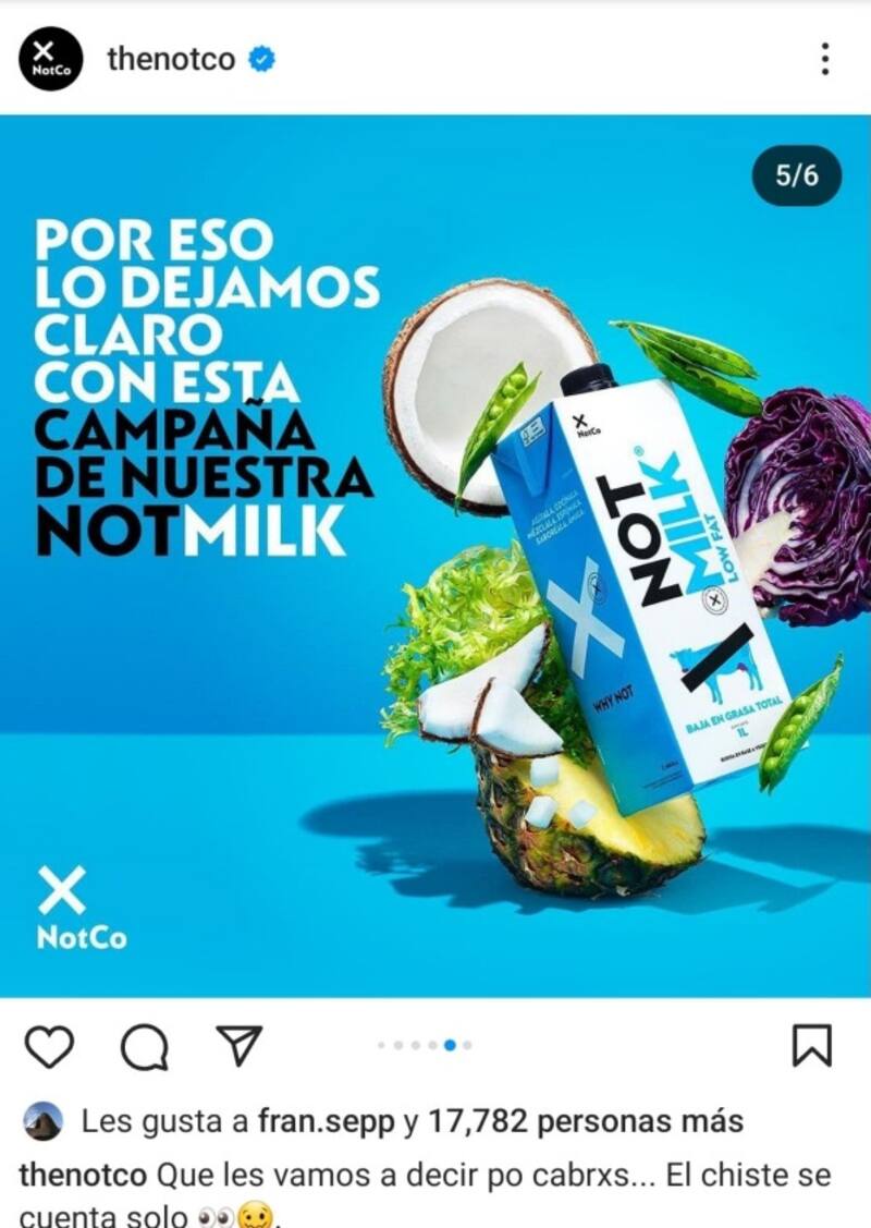 Por su parte, el abogado José Coz, socio de Coz & Blavi, en representación de Aproval presentó al tribunal de alzada dos fotografías subidas por NotCo en su perfil de Instagram, las cuales demostrarían el corazón del caso: que la publicidad de NotMilk efectivamente produce confusión en cuanto a si es o no leche.