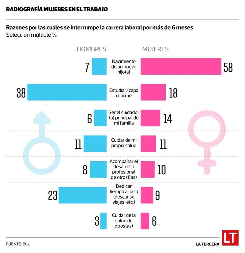 De acuerdo a la Radiografía Mujeres en el Trabajo, hombres y mujeres interrumpen su carrera laboral en una proporción similar. Pero las razones no son las mismas, las pausas laborales por razones familiares no están dentro de las razones principales mencionadas por los hombres (estudiar y tiempo de ocio).