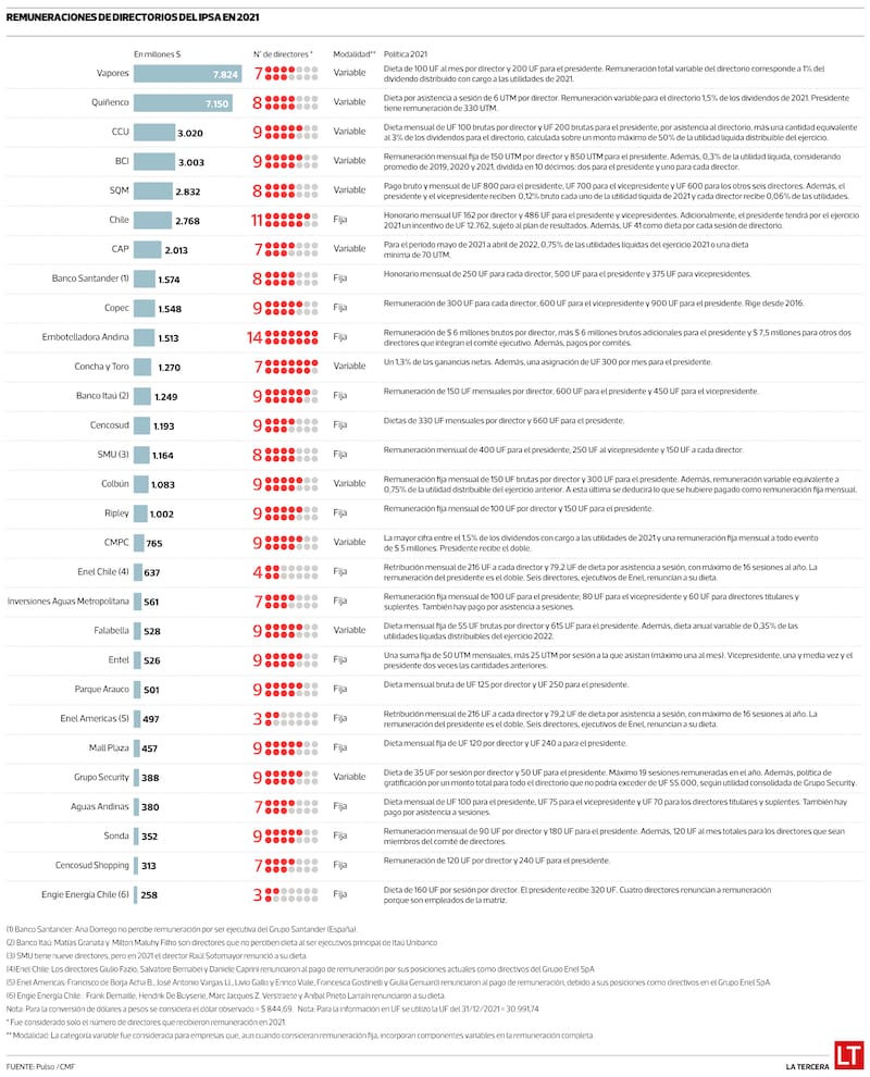 Esas empresas, además, lideraron el año pasado los directorios mejor pagados, como cifra total recibida por todos sus integrantes (ver infografía). Las cinco principales tienen componentes variables y las tres primeras son del grupo Luksic: Vapores; Quiñenco, en segundo lugar, empujada por Vapores, filial del holding; y la cervecera CCU. Quiñenco reparte el 1,5% de los dividendos para sus nueve directores y CCU, un 3%, pero calculado sobre un tope del 50% de la utilidad distribuible. Todos esos pagos variables se combinan, en casi todas las empresas, con un componente fijo: dietas fijas al mes de 100 Unidades de Fomento (UF) en Vapores y CCU, o dietas por sesión de 6 Unidades Tributarias Mensuales, UTM, en Quiñenco.