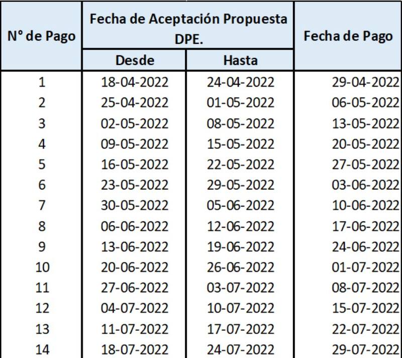 La primera fecha de pago será el 29 de abril, para quienes hayan aceptado la propuesta entre el 18 y 24 de este mes. La última fecha de pago en tanto está contemplada para el 29 de julio, para quienes acepten la propuesta entre el 18 y 24 de dicho mes.