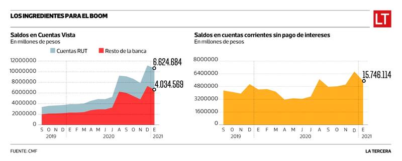 Para graficar más nítidamente los mayores recursos con los que cuentan las familias, las cifras de la Comisión para el Mercado Financiero (CMF) muestran la evolución de los saldos en las cuentas vista y corrientes. Si en enero de 2020 las cuentas Rut de BancoEstado tenían $ 2,3 billones (unos US$ 3.280 millones), un año después, en enero de 2021, ese monto subió 186%, llegando a $ 6,6 billones (US$ 9.430 millones). Hoy hay 15.113.634 cuentas Rut, por lo que en promedio cada persona tiene $ 440 mil en su cuenta. Hace un año era de $ 164 mil. Las cuentas vista del resto de los bancos también mostraron un salto de 153%, pasando de $ 15 billones a $ 40 billones en ese mismo período. Y en montos promedios subieron de $ 286 mil a $ 612 mil.
