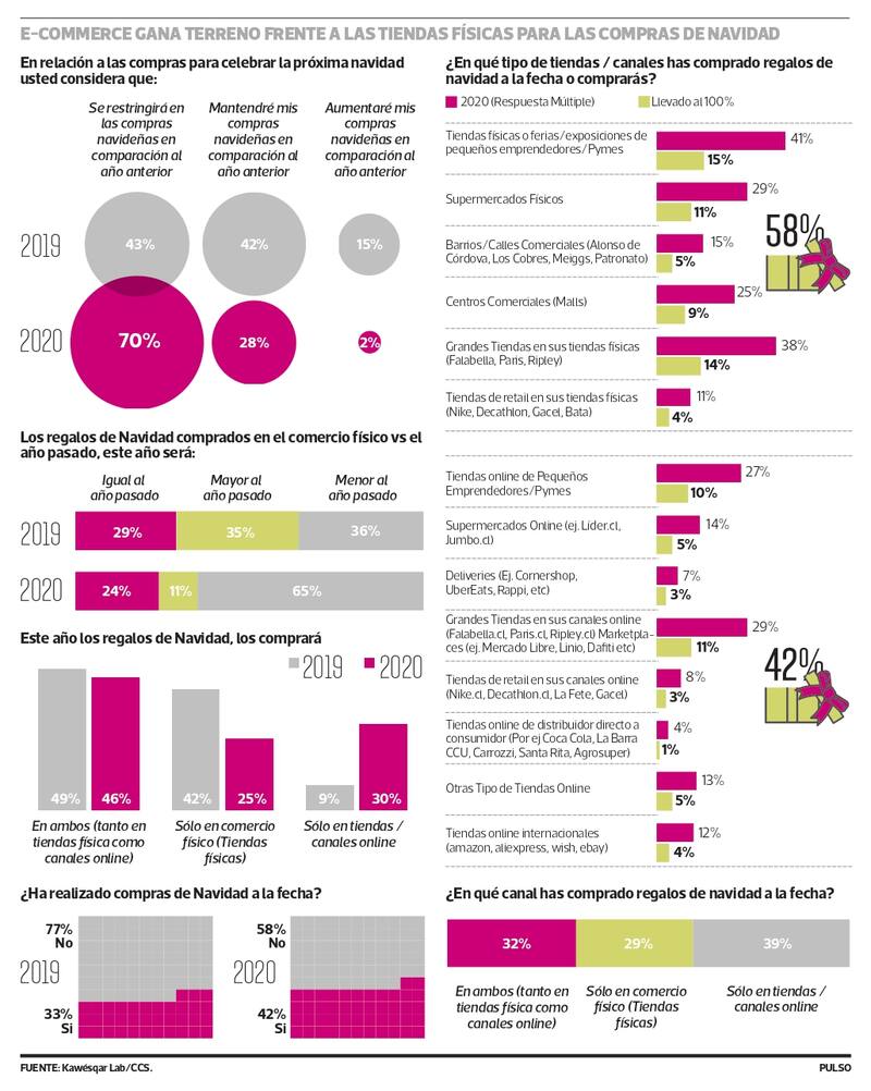 El bolsillo de los chilenos acusa el golpe de la crisis del Covid-19 y los consumidores se vuelven más cautos en estas fiestas. Eso es justo lo que muestra un estudio conjunto entre Kawésqar Lab y la Cámara de Comercio de Santiago (CCS), a partir de una encuesta realizada entre el 1 y 2 de diciembre, sobre una muestra de 313 casos.