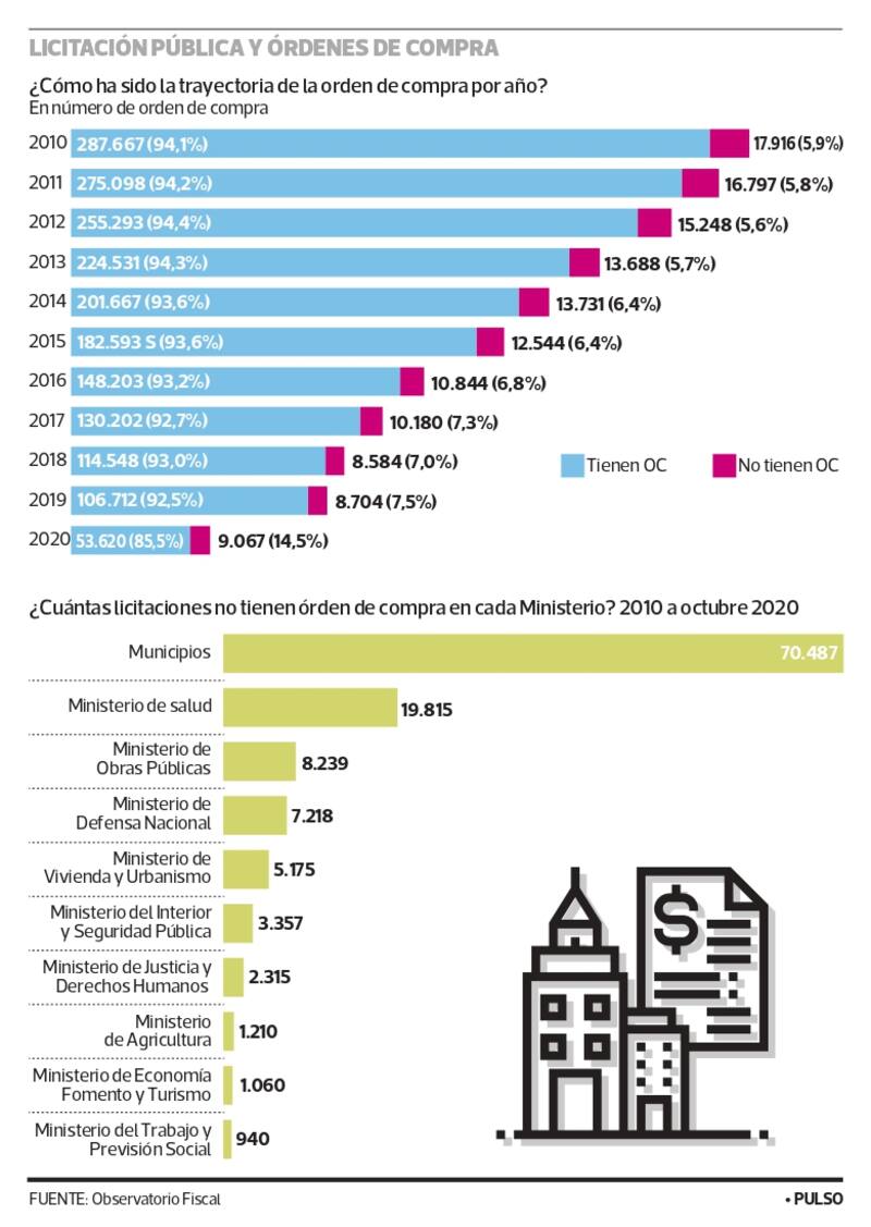 El porcentaje de licitaciones que no tienen órdenes de compra asociadas ha fluctuado entre 5,9% y 7% entre 2010 y 2019, pero en 2020 hubo un salto a 14%, según el análisis del Observatorio Fiscal.