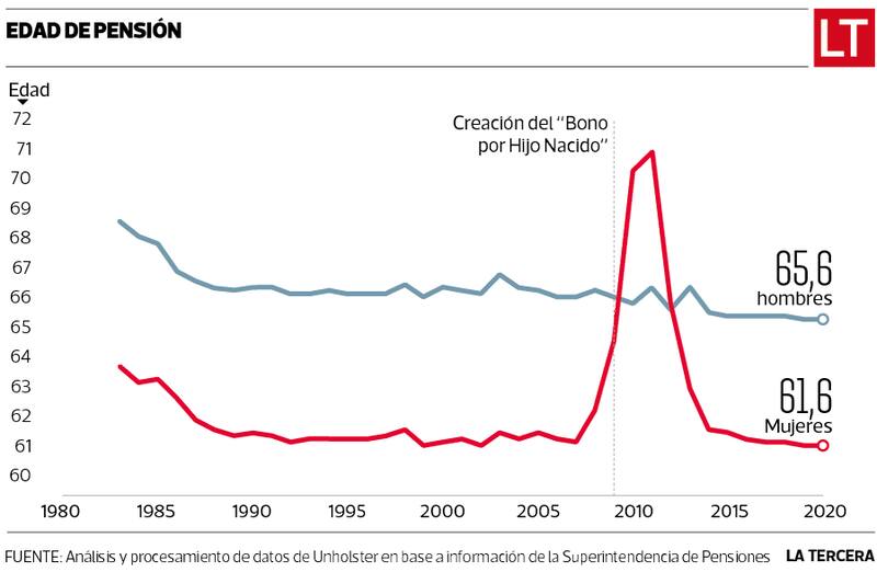 La razón, explica el director de Data Science de Unholster, Cristóbal Huneeus, puede estar relacionada con el efecto que tuvo la reforma previsional de 2008 -promulgada en el primer gobierno de la expresidenta Michelle Bachelet- y el llamado Bono por Hijo Nacido. Al incluirse este beneficio, detalla, muchas mujeres que no habían podido jubilarse lo hicieron en esa oportunidad, subiendo la edad promedio en ese momento específico y luego volvió a la tendencia normal.