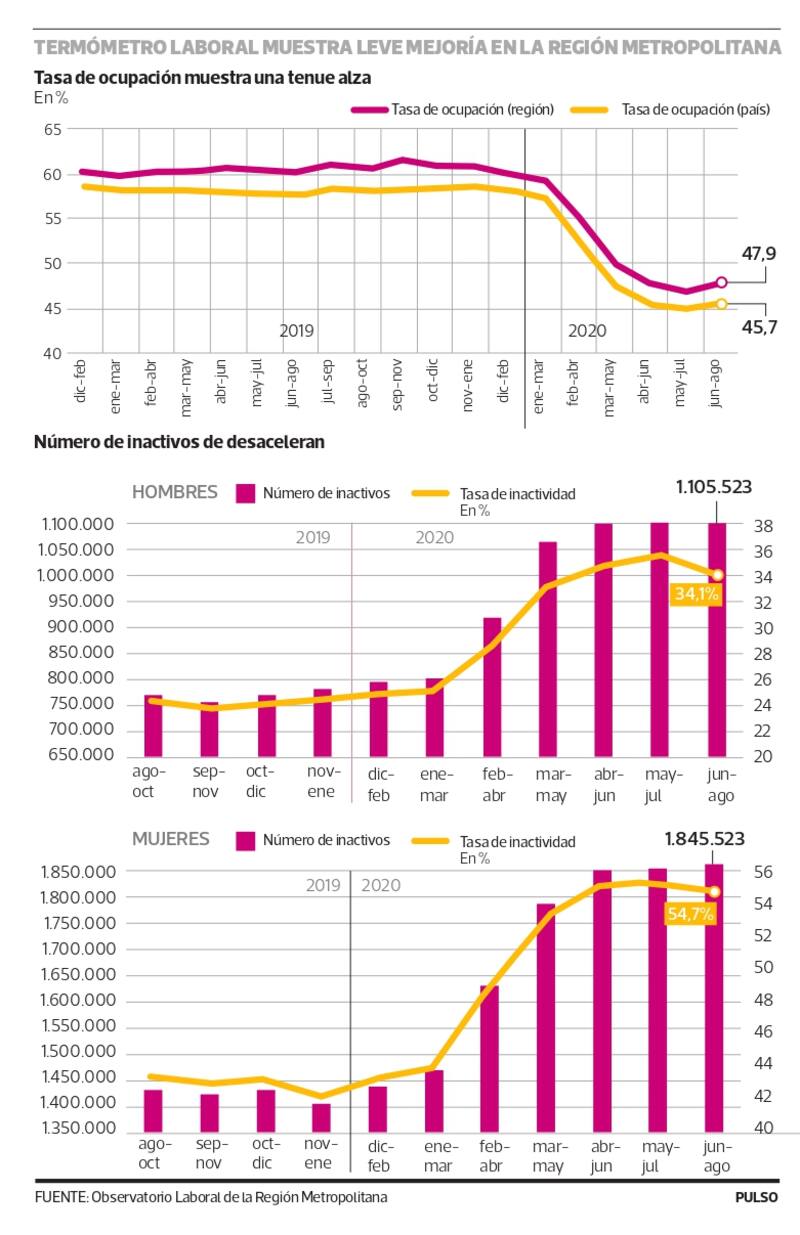 El mercado laboral parece estar dejando lo peor atrás. En el trimestre junio-agosto, los puestos de trabajo, si bien cayeron 19,4% en 12 meses, respecto al mes previo se registró un aumento de 119 mil empleos. Esto da cuenta de una leve mejoría. Esa misma tendencia es lo que muestra un informe del Observatorio Laboral de la Región Metropolitana (OLRM), iniciativa liderada por Sence y ejecutada por el Centro de Políticas Públicas UC y Otic Sofofa.