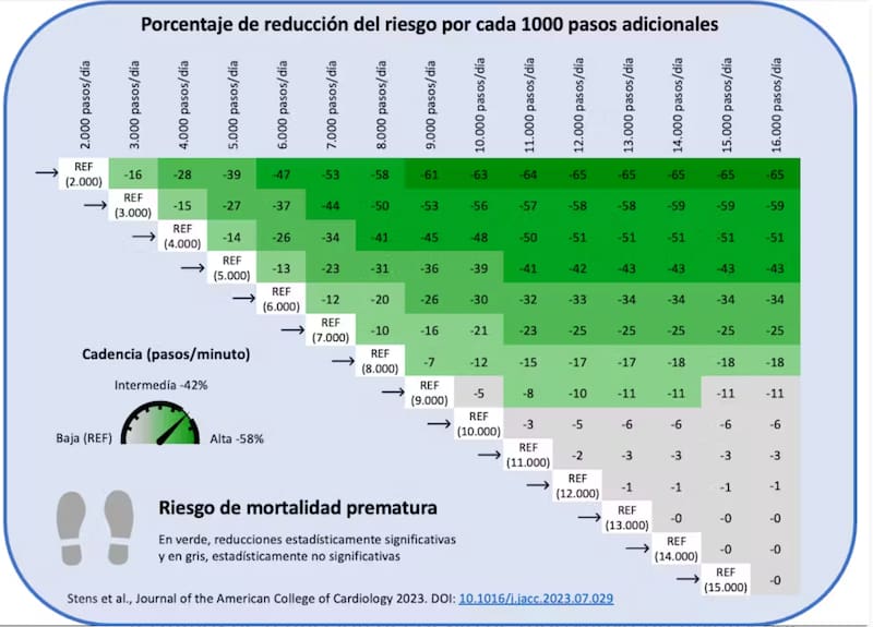 Esta tabla muestra, partiendo de diferentes números de pasos diarios, cuántos beneficios adicionales se pueden obtener en términos de reducción del riesgo de mortalidad prematura por cada 1000 adicionales. Nos indica, por ejemplo, que una persona que realiza normalmente 3000 pasos al día obtendría un 15 % de reducción en riesgo de mortalidad añadiendo mil más por jornada, el equivalente a unos diez minutos andando.