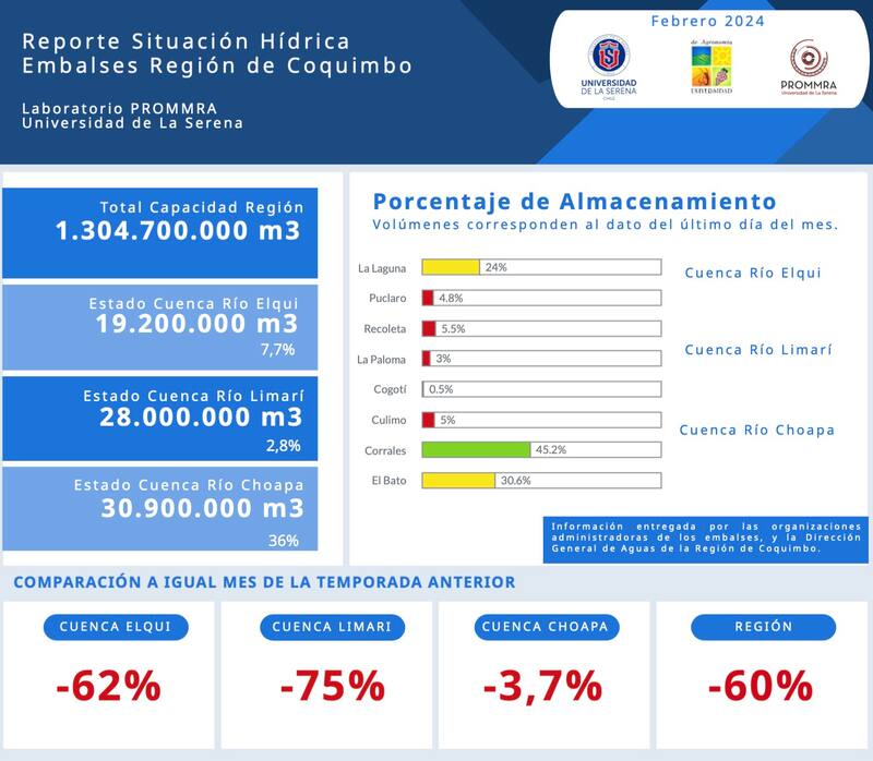 Una importante baja en los niveles de almacenamiento en los embalses de la Región de Coquimbo reportó este miércoles el Laboratorio de Prospección, Monitoreo y Modelación de Recursos Agrícolas y Ambientales (PROMMRA) de la Universidad de La Serena, que en su último informe de situación de hídrica de embalses de la zona, muestra que el estado de las tres cuencas -Elqui, Limarí y Choapa- solo alcanzan el 6% de capacidad total.