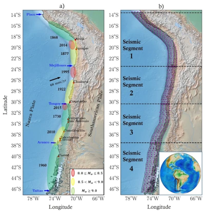 Se ubicaron en diez ciudades que se encuentran en la zona de subducción de Chile-Perú: Arica, Iquique, Chañaral, Coquimbo, Valparaíso, San Antonio, Constitución, Talcahuano, Coronel y Corral. Estas ciudades fueron seleccionadas debido a sus diversas morfologías, incluyendo grandes áreas planas, así como estrechos valles fluviales con pendientes pronunciadas.