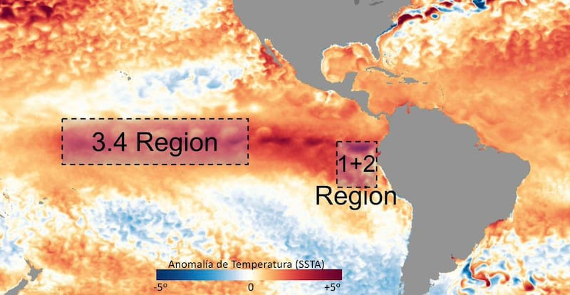 Cordero explica que durante febrero se registró una explosiva alza en la temperatura superficial del Pacífico oriental, directamente frente a las costas de Perú y Ecuador. “Esta zona del Pacífico se conoce técnicamente como la región 1 + 2. En esta región, la temperatura subió en cuestión de tres semanas 1,5°C, y actualmente se encuentra por encima del umbral qué define un evento de El Niño costero”.