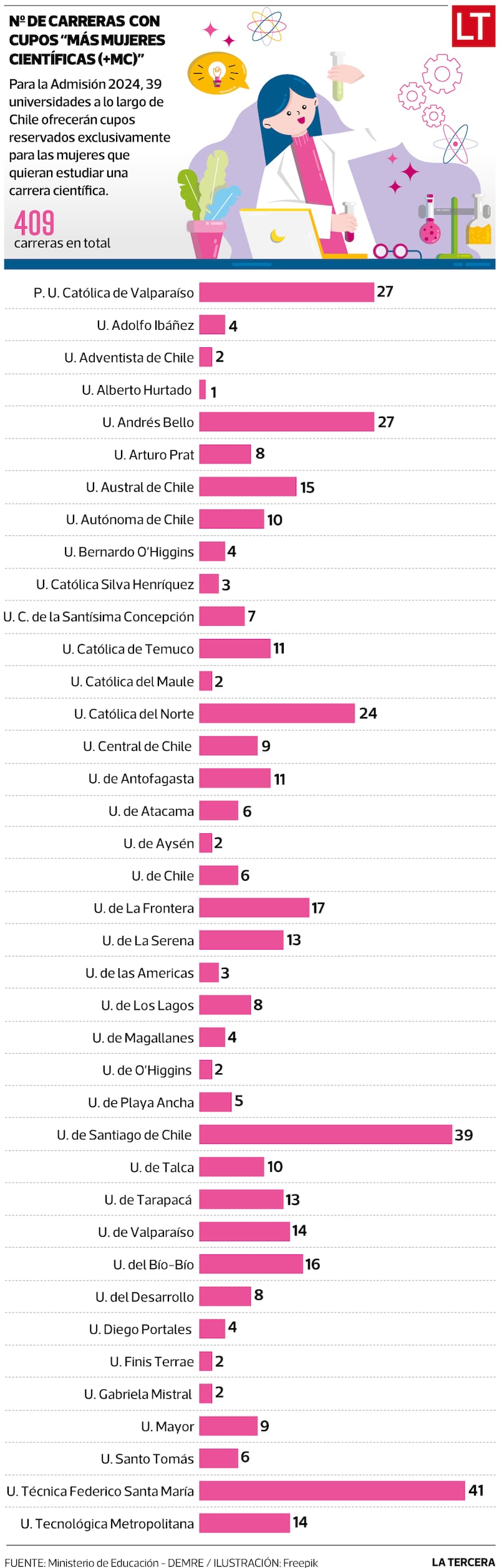 Para la Admisión 2024, se darán cupos exclusivos para mujeres en carreras relacionadas a la ciencia, la tecnología, la ingeniería y la matemática, una medida que se espera ayude a disminuir la brecha de género, en el que Chile es el cuarto país con menos mujeres tituladas en esta área de los países OCDE.
