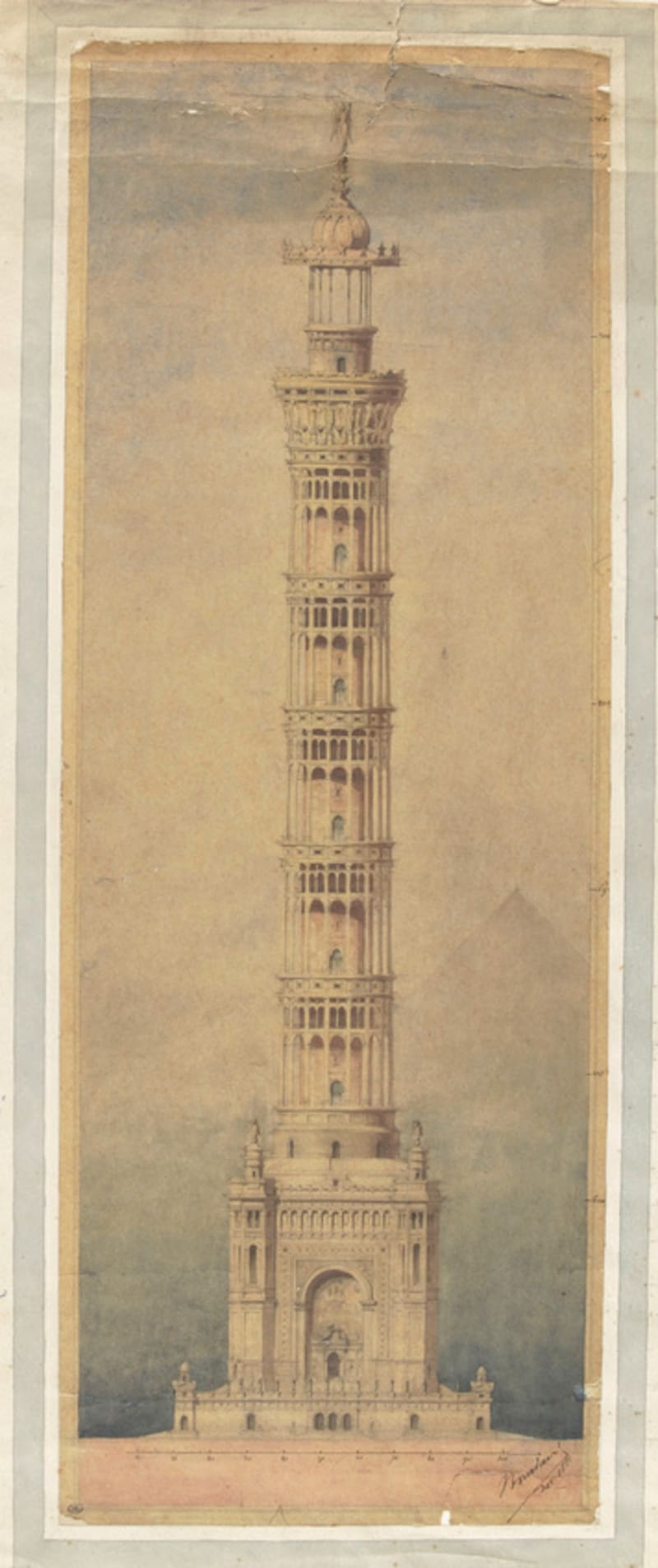 Una de las propuestas con mayor aceptación fue hecha por Jules Bourdais, un arquitecto de la época que se comenta que tenía una profunda rivalidad con Gustave Eiffel. De acuerdo al sitio oficial del monumento actual, la propuesta de Bourdais se trataba de una torre monumental de 370 m de altura, hecha en granito y pórfido y con un faro en su punto máximo.