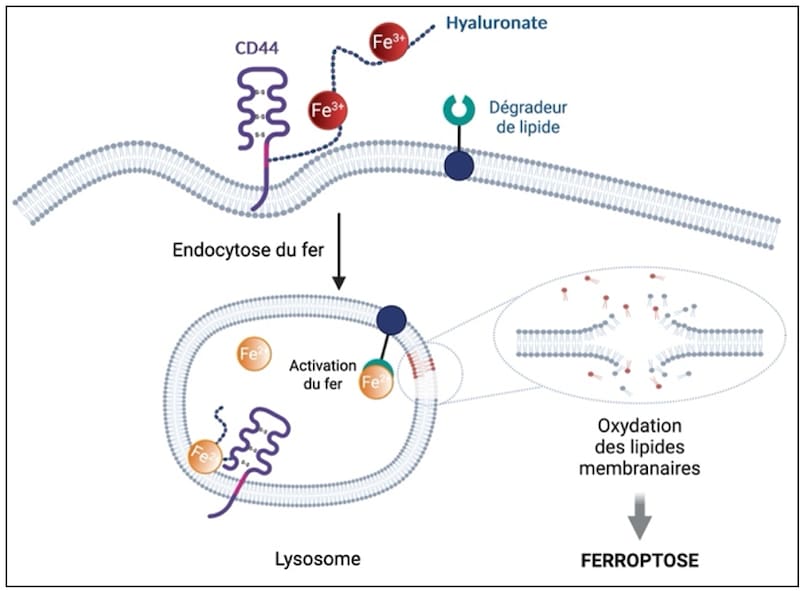 Estas moléculas poseen un fragmento que les permite dirigirse a la membrana celular (membrana plasmática) y acumularse posteriormente en los lisosomas mediante endocitosis, así como otra parte que se une al hierro, abundante en este compartimento de las células cancerosas prometastásicas, y aumenta su reactividad, desencadenando así la ferroptosis.