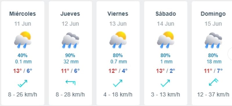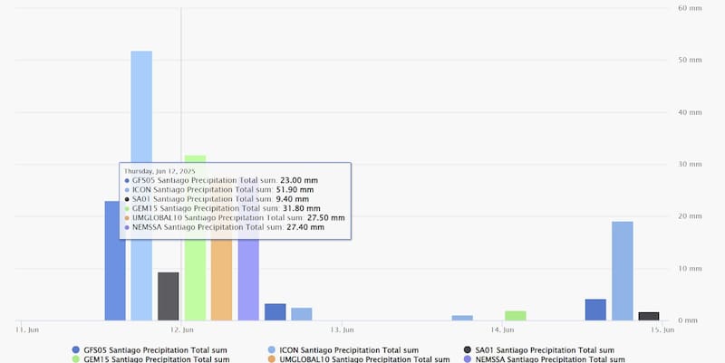 Según la proyección del portal meteorológico Meteored, las precipitaciones comenzarían el miércoles 11 de junio, pero las lluvias más intensas llegarán el jueves, día que podrían superar los 30 mm de agua caída.