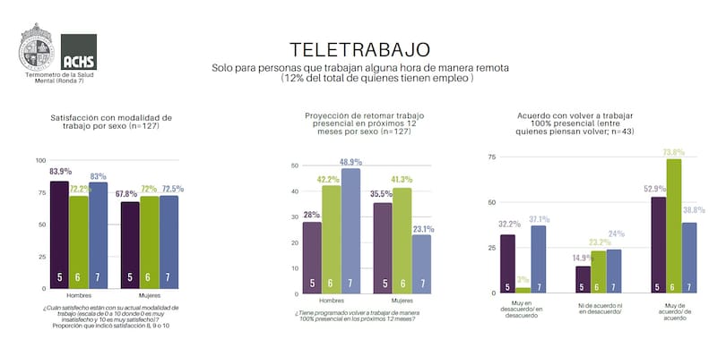Los resultados sugieren cambios con respecto a lo que implicó el Covid-19 en la sociedad. En relación al teletrabajo, modalidad laboral ampliamente extendida durante la pandemia, y que en algunos trabajos aún permanece, el estudio de la UC señala que el 83% de los hombres se siente satisfecho con esta forma de trabajo, mientras que en el caso de las mujeres la cifra alcanza un 72,5%.