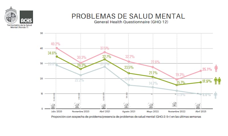 El estudio también reveló que el 17,5% de los encuestados sospecha la presencia de problemas de salud mental. Si bien esta proporción sigue siendo menor en 15-17 puntos respecto de lo exhibido en julio de 2020 y en abril de 2021, actualmente se registra un alza de 1,8%, que se explica por una tendencia dispar: un aumento en los problemas de salud mental de las mujeres de 5,8% junto con una caída de 2,3% en los problemas registrados por los hombres. “Si bien es una proporción importante de la población, equivale a la mitad de lo más alto reportado en nuestra medición de julio de 2020″, establece Bravo.