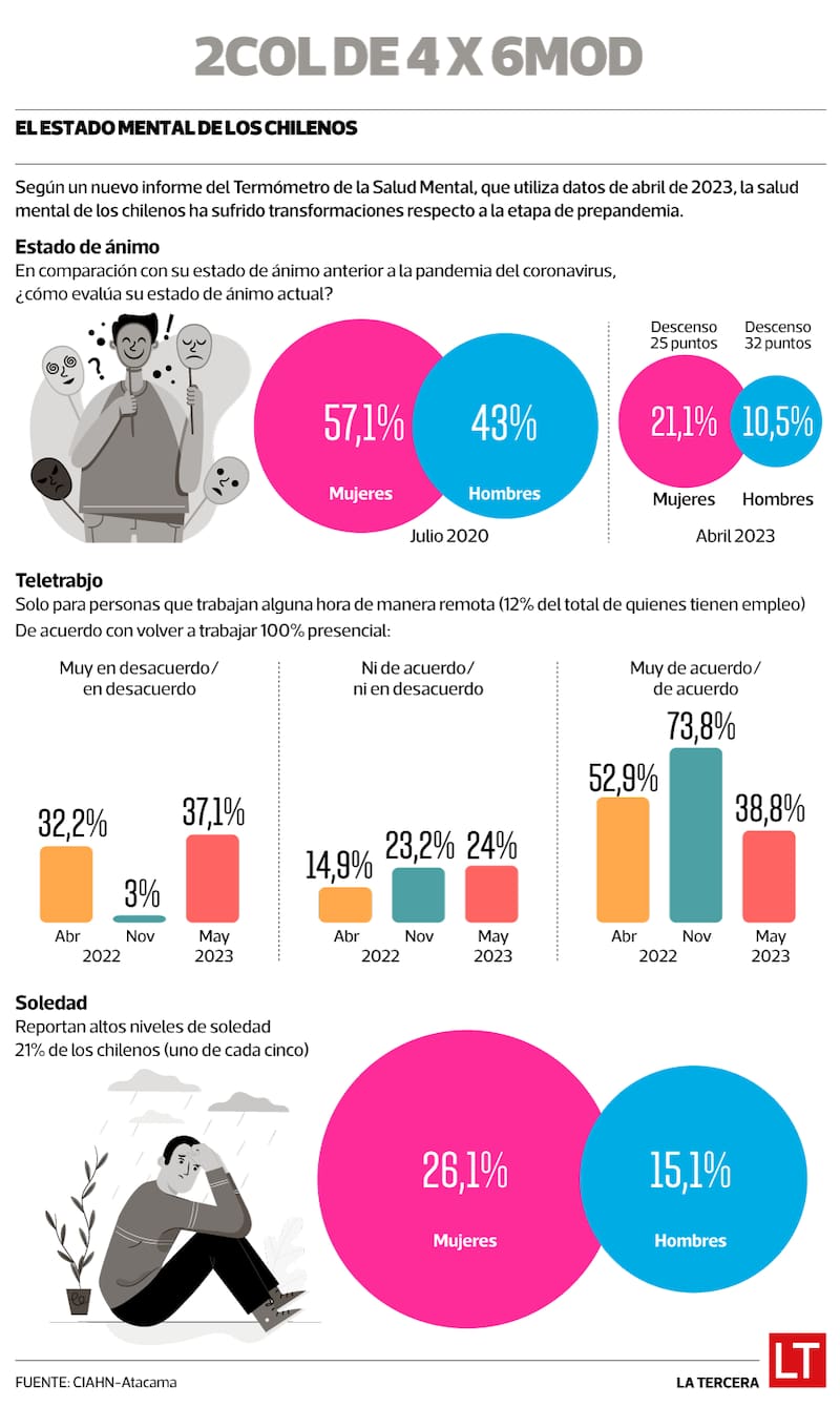 “Encontramos que respecto de nuestra medición anterior en noviembre de 2022, que hay un alza importante en los problemas de salud mental y de depresión en mujeres, mientras que se reporta la tendencia contraria (una caída) en el caso de los hombres. Esta es la novedad que encontramos en esta medición, un aumento de la brecha de género en problemas de salud mental”, resume Bravo.