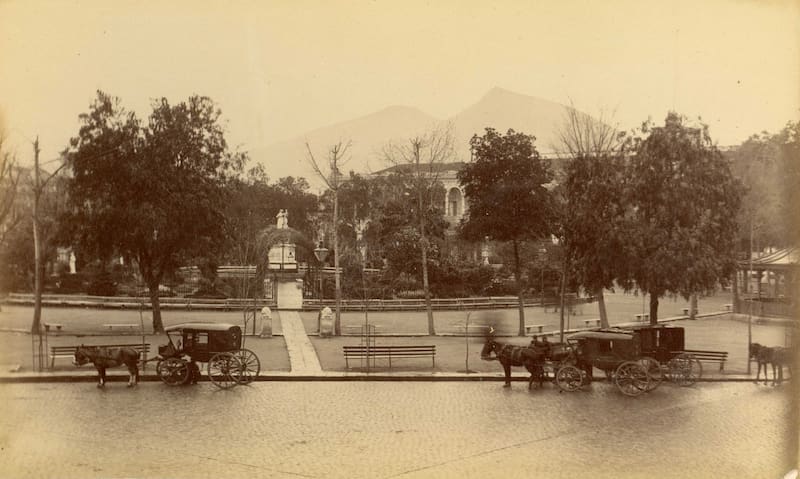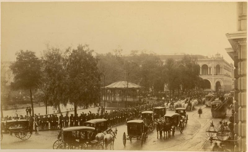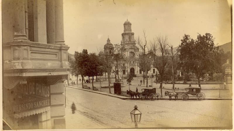 Imágenes capturadas hace 134 años en el centro de la capital dan cuenta de la vida de esos años, sin automóviles, ni semáforos y con una plaza pequeña, angosta y rodeada de austeros edificios.