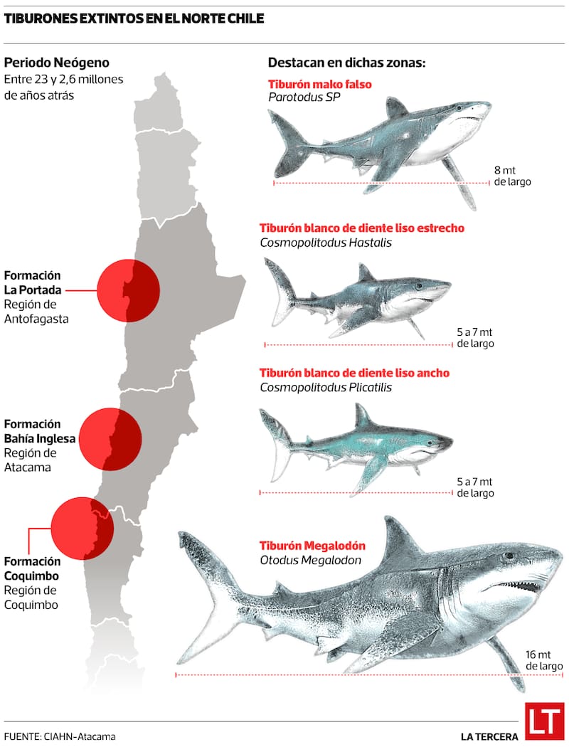 Investigadores de la Corporación para la Investigación y Avance de la Paleontología e Historia Natural de Atacama (CIAHN-Atacama) publicaron un estudio sobre la diversidad de tiburones fósiles que se han encontrado en el norte de Chile. Lograron categorizar más de 28 especies o géneros, desde enanos de menos de un metro, hasta el gigantesco megalodón de 18 metros de largo. Este último es el tiburón más grande del que se tenga registro en el mundo.