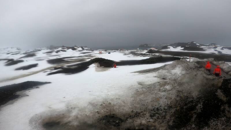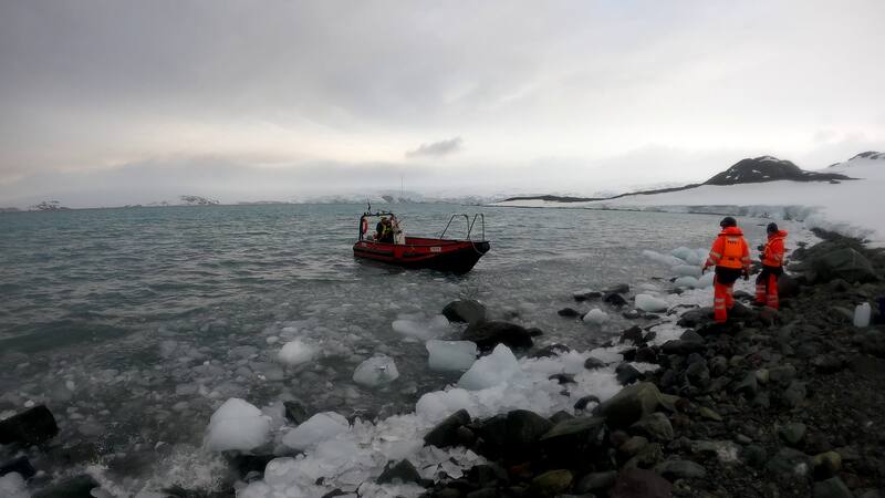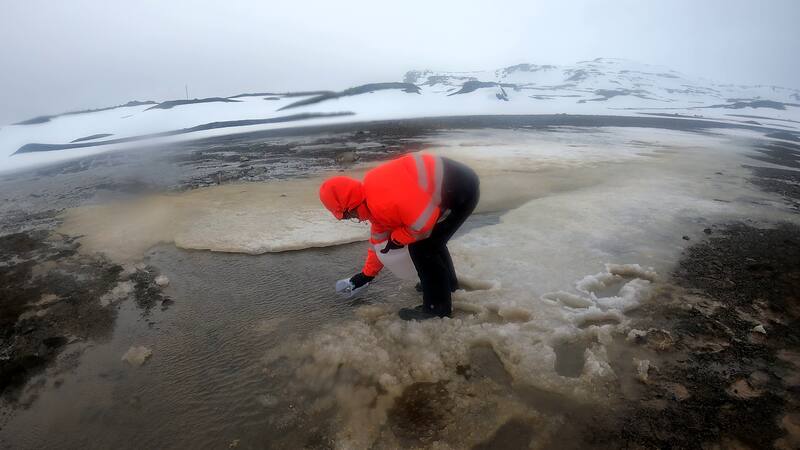 La lluvia lava con extrema rapidez la poca nieve que se acumuló en la isla durante el invierno y al derretirse y seguir su inexorable camino hacia el mar arrastra consigo múltiples elementos y sustancias que afectan a los organismos microscópicos que viven en las aguas de la bahía. Por eso, armados con jarras plásticas y bidones salimos a tomar muestras de agua para determinar qué es lo que se está transportando y así poder inferir cómo responderán los microorganismos marinos a estas nuevas condiciones que cada vez serán más comunes y acentuadas.