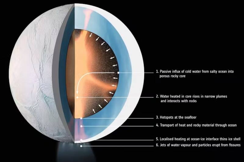 Al igual que los océanos de la Tierra, el océano de Encelado contiene sal, la mayor parte de la cual es cloruro de sodio, comúnmente conocido como sal de mesa. El océano también contiene varios compuestos a base de carbono y tiene un proceso llamado calentamiento de las mareas que genera energía dentro de la luna. El agua líquida, la química basada en el carbono y la energía son ingredientes clave para la vida.