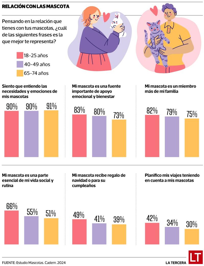 Según la encuesta CADEM, la frase que mejor representa a las personas cuando piensan en su mascota es “Siento que entiendo las necesidades y emociones de mi mascota”, seguida de “Mi mascota es una fuente importante de apoyo y bienestar” (ver infografía).
